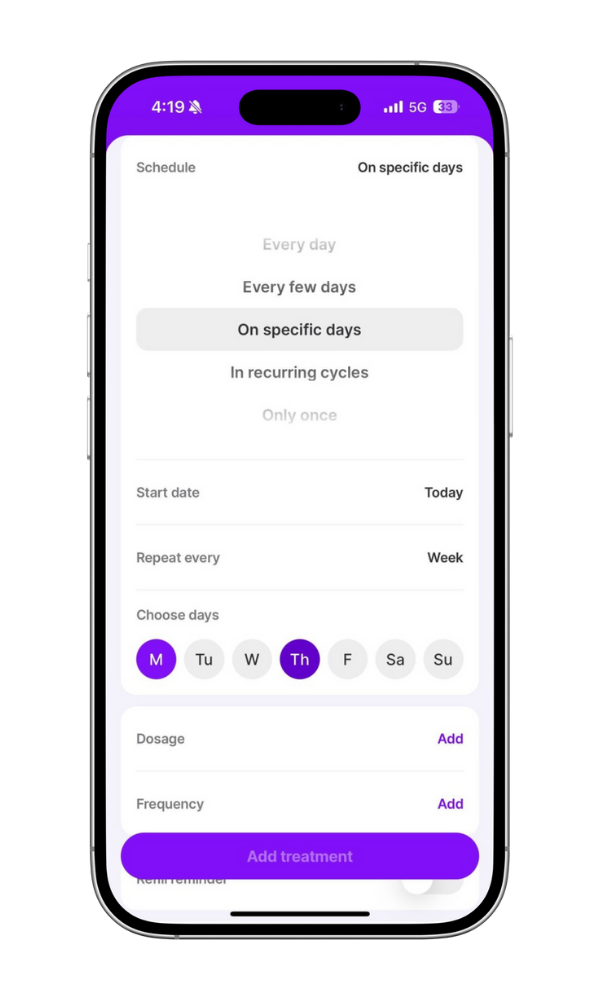 - Change the Schedule to 'On specific days' > Select the M, Tu, W, Th, F, Sa, Su options to mark which days you need to take the treatment